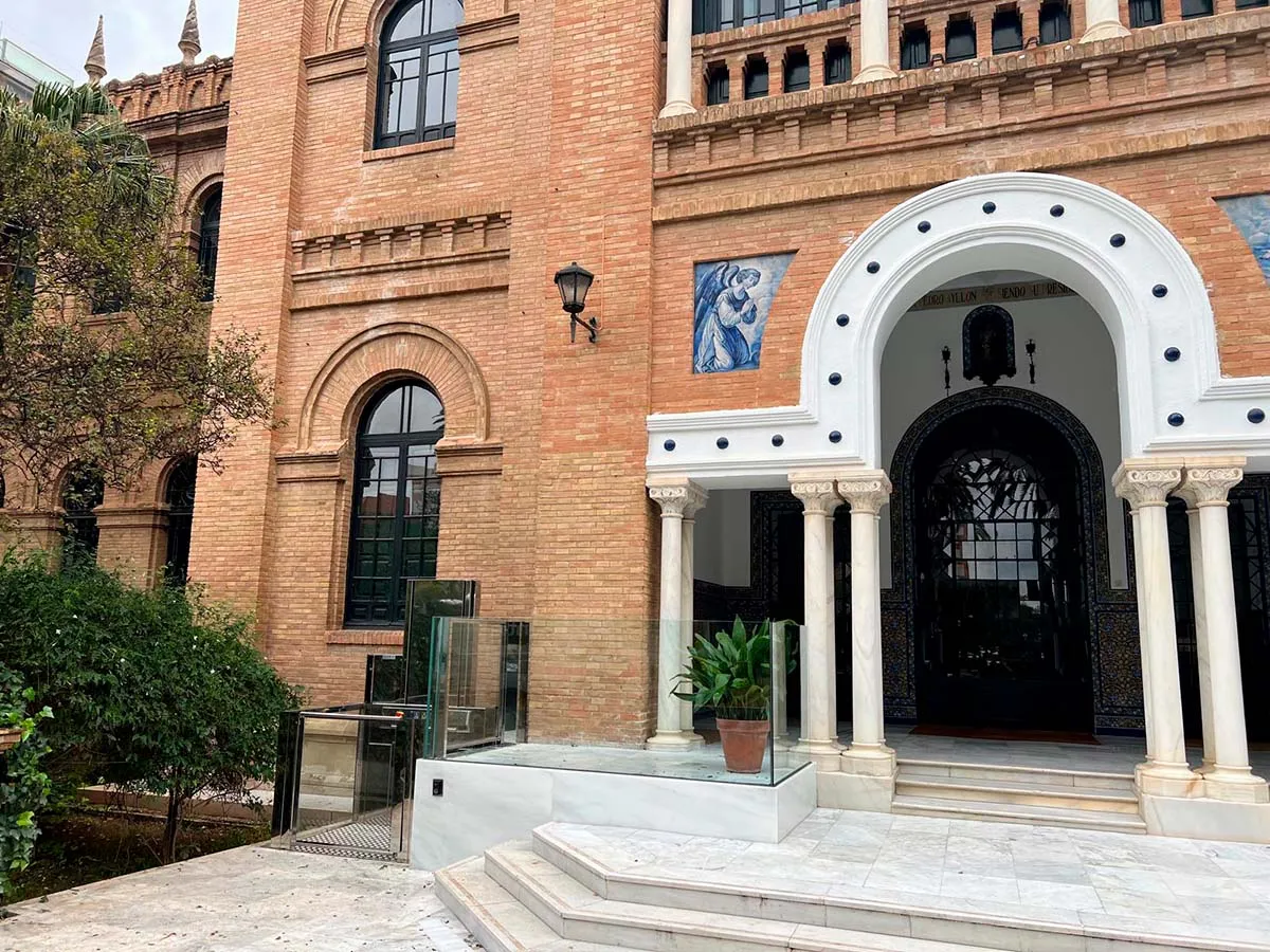 En la sede de San Telmo Business School, en Sevilla, el acceso principal presentaba un desnivel resuelto mediante una escalinata exterior, lo que suponía una barrera para personas usuarias de silla de ruedas o con movilidad reducida. Dada la intensa actividad formativa y empresarial del centro, era necesario habilitar un itinerario accesible que garantizase la entrada autónoma y segura de todo el alumnado, profesorado y visitantes, preservando al mismo tiempo la estética del edificio histórico.