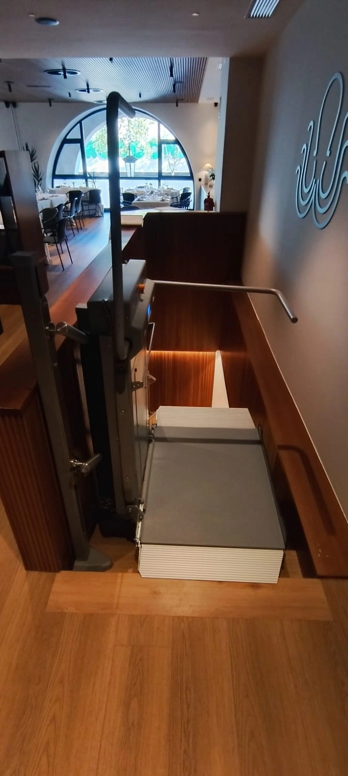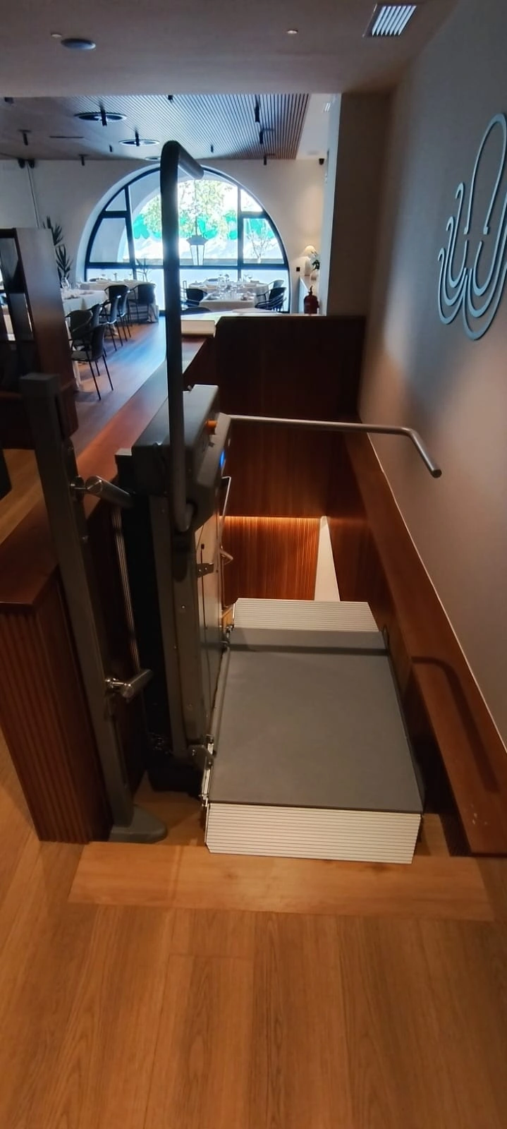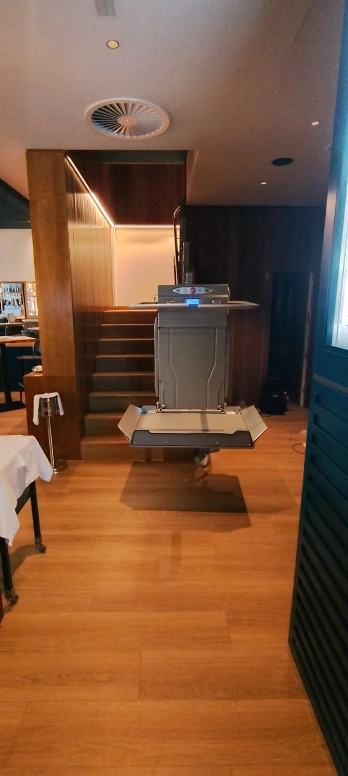En la Taberna Santa Justa, en Sevilla, el acceso entre niveles se resolvía mediante una escalera interior muy ajustada de espacio, lo que suponía una limitación clara para clientes con movilidad reducida o usuarios de silla de ruedas. Al tratarse de un restaurante con un tránsito continuo de personas, era prioritario disponer de un sistema que permitiera salvar el desnivel sin comprometer el paso por la escalera ni alterar la estética cálida del local.