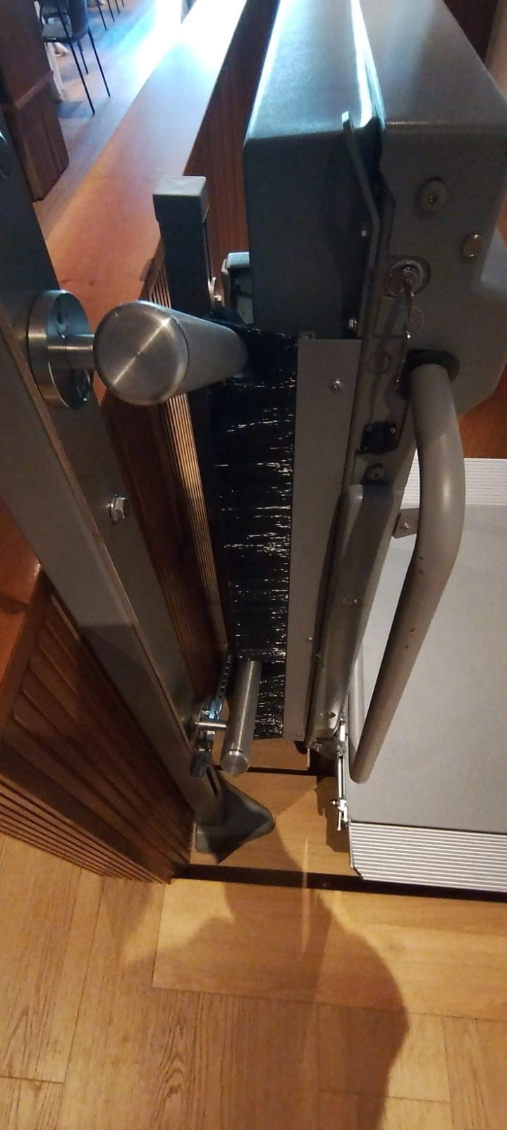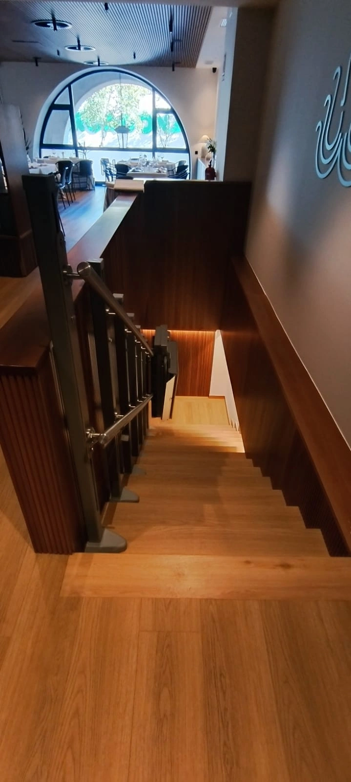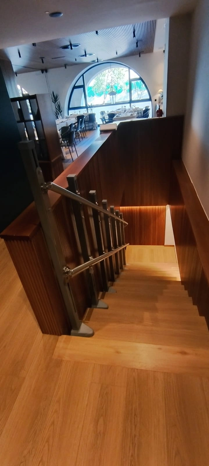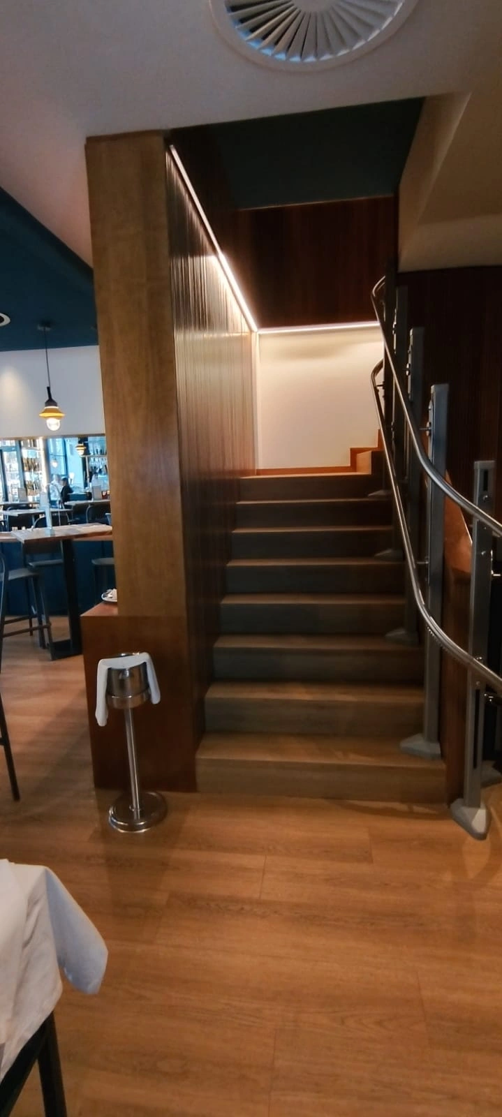 En la Taberna Santa Justa, en Sevilla, el acceso entre niveles se resolvía mediante una escalera interior muy ajustada de espacio, lo que suponía una limitación clara para clientes con movilidad reducida o usuarios de silla de ruedas. Al tratarse de un restaurante con un tránsito continuo de personas, era prioritario disponer de un sistema que permitiera salvar el desnivel sin comprometer el paso por la escalera ni alterar la estética cálida del local.