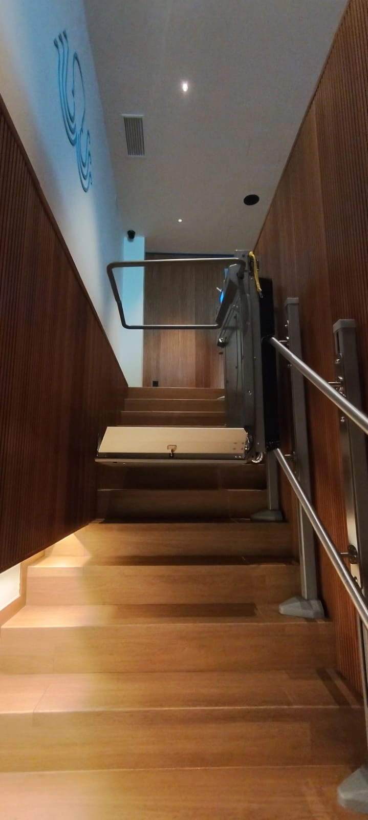 Para dar respuesta a esta necesidad, Vilber ha instalado una plataforma salvaescaleras modelo PETC-AS, diseñada específicamente para escaleras estrechas. La guía se adapta al trazado de los peldaños y la plataforma se pliega cuando no está en uso, manteniendo libre la zona de circulación. El equipo incorpora elementos de protección, rampas abatibles y mandos de uso sencillo que garantizan un desplazamiento seguro y confortable para el usuario. Con esta intervención, Vilber reafirma su compromiso con soluciones de accesibilidad fiables, seguras y de alta calidad en espacios de hostelería.