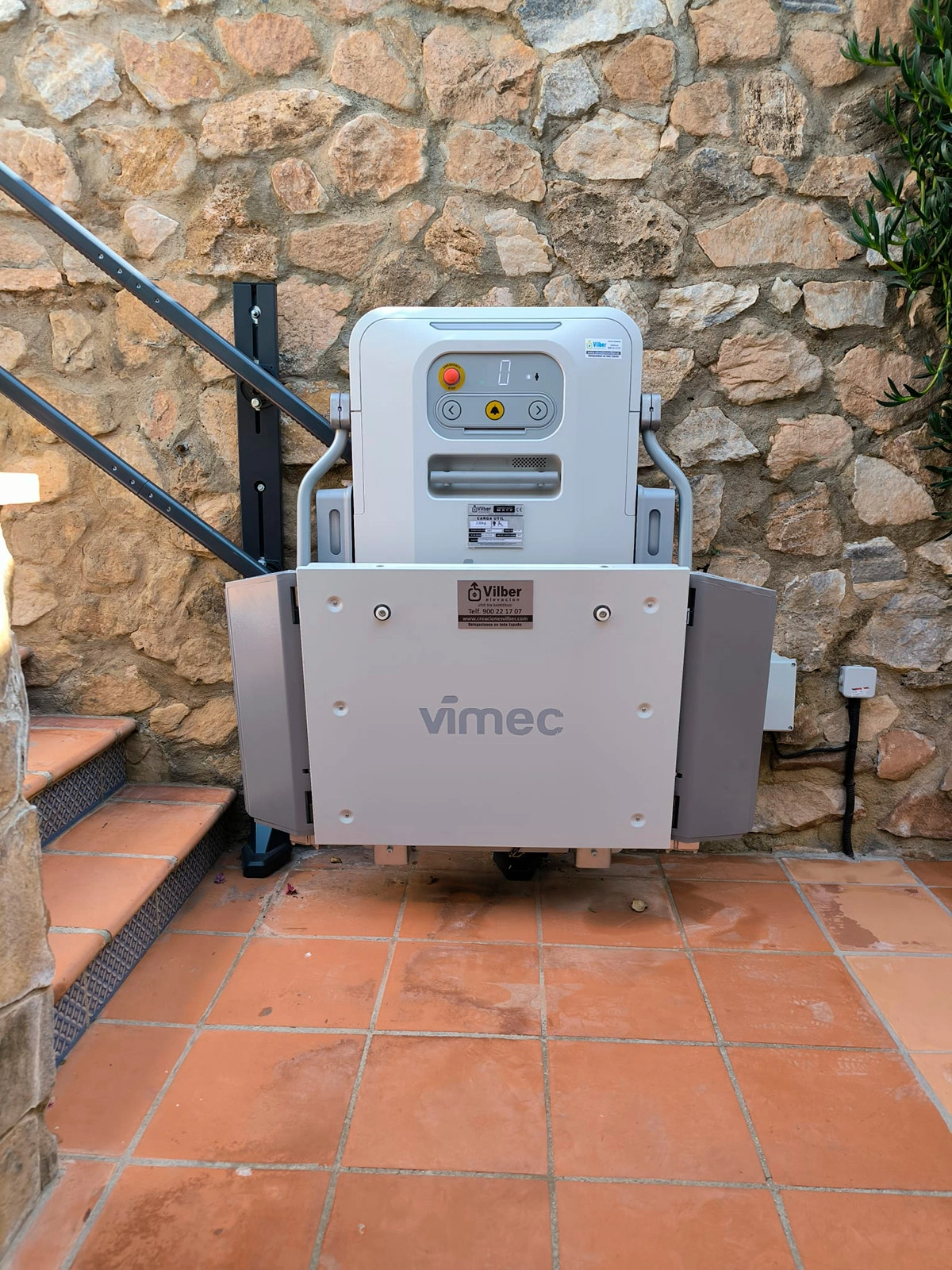 Para garantizar un itinerario accesible en este entorno, hemos instalado una plataforma salvaescaleras inclinada modelo PETC-6S, diseñada específicamente para trabajar en exteriores y adaptada al trazado curvo de la escalera existente. La plataforma permite el desplazamiento cómodo y seguro de usuarios en silla de ruedas, se pliega cuando no está en uso para mantener libre el paso y cuenta con sistemas de mando y seguridad que facilitan su utilización.