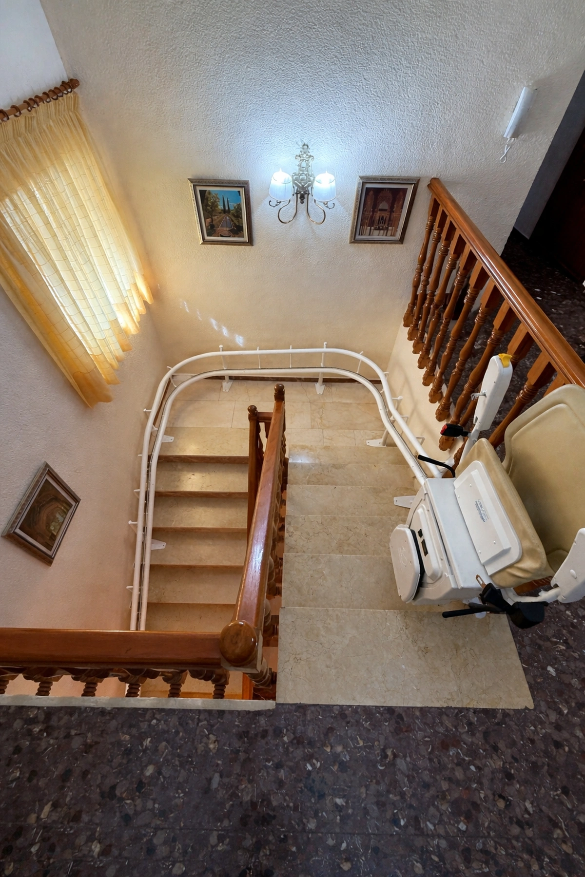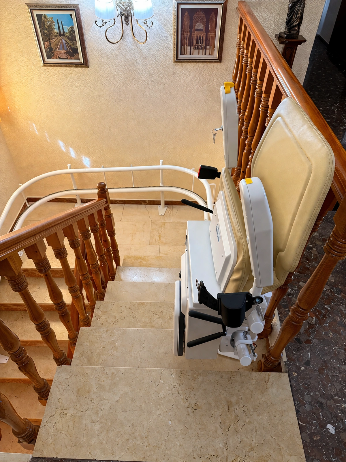 En una vivienda particular de Peligros, en Granada, la presencia de una escalera interior con varios tramos y giro intermedio hacía necesario incorporar una solución que facilitara el desplazamiento entre plantas sin alterar el uso cotidiano del espacio. En este tipo de entornos residenciales, mejorar la accesibilidad es clave para mantener la autonomía dentro del hogar y garantizar un tránsito más seguro en una zona de paso frecuente.