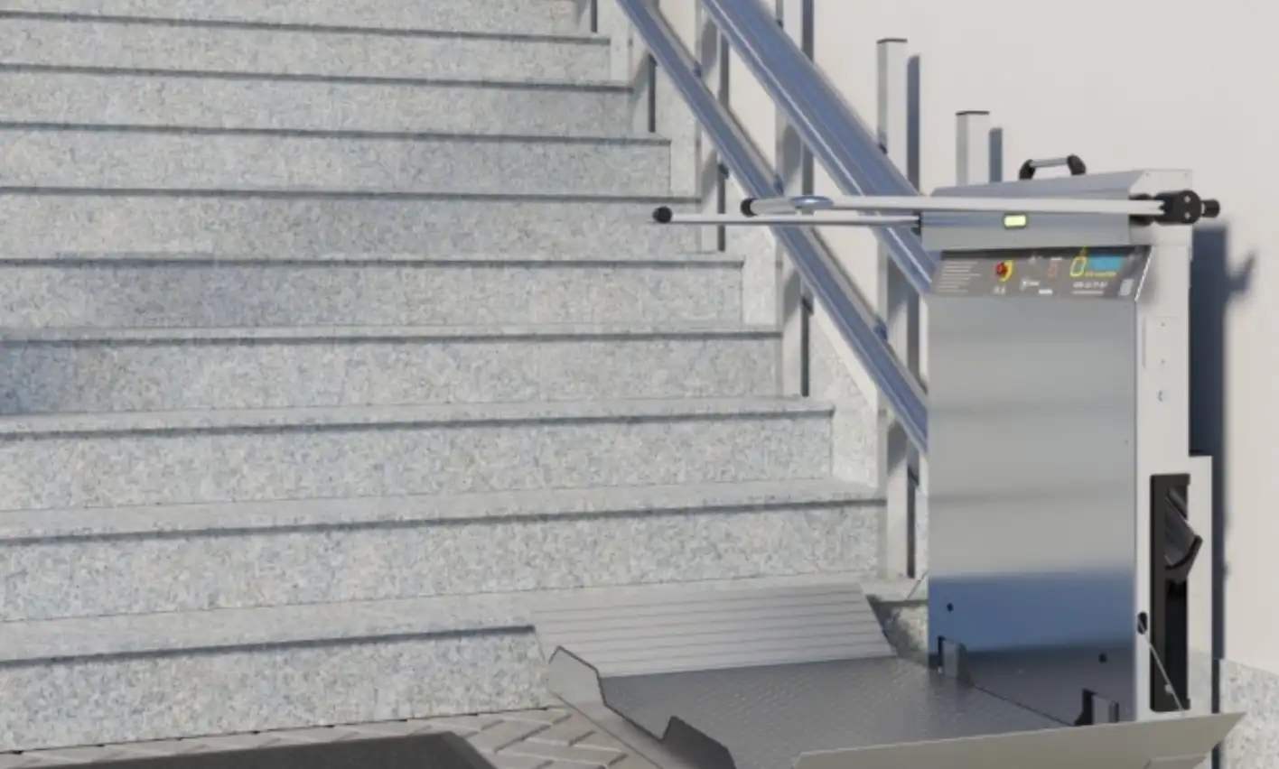 The PETR-N stairlift platform is designed for straight staircases and enhances mobility with a discreet integration into its surroundings. It features an LED control panel, obstacle detection, and retractable arms for safe and comfortable use. Its guide rail, made of stainless steel, also functions as a handrail and allows for easy installation on a wall or pillar.