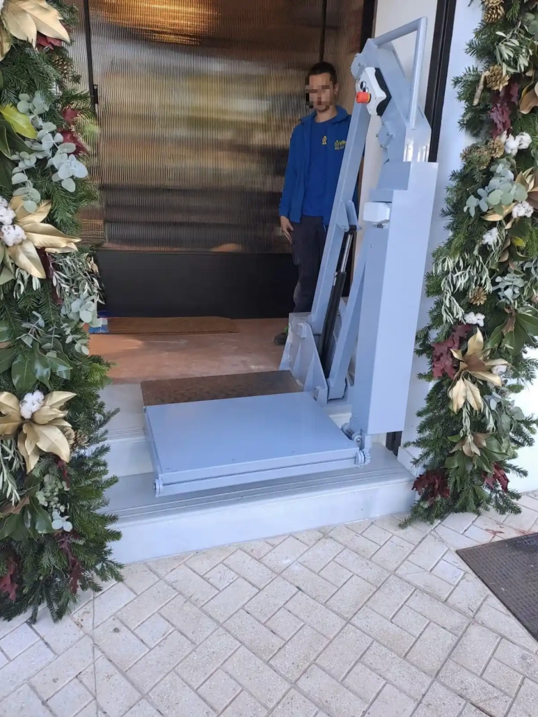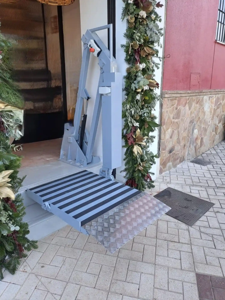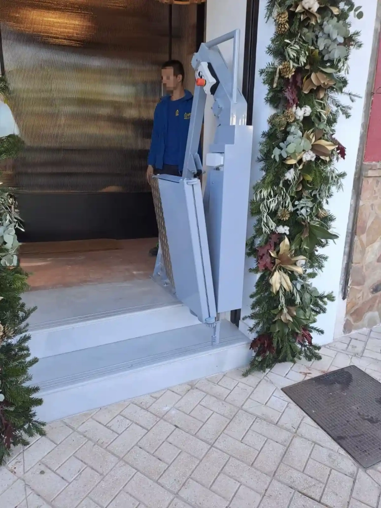 El EVP-SPIN es un elevador diseñado para eliminar barreras arquitectónicas en accesos con desniveles, especialmente en portales, locales comerciales y entornos urbanos donde no es posible instalar un ascensor convencional. Se trata de un salvaescaleras monobrazo lateral con plataforma de doble plegamiento, una solución compacta y funcional que combina accesibilidad, seguridad y mínimo impacto visual.