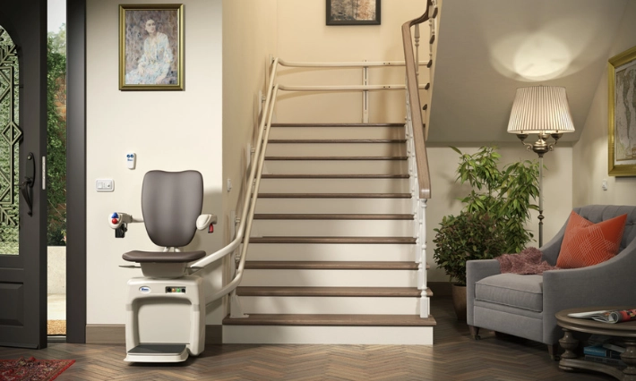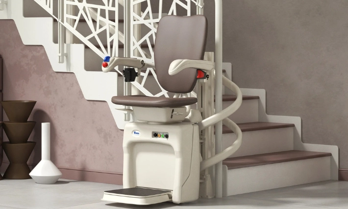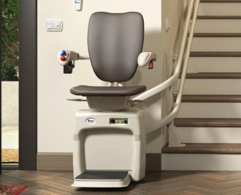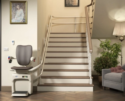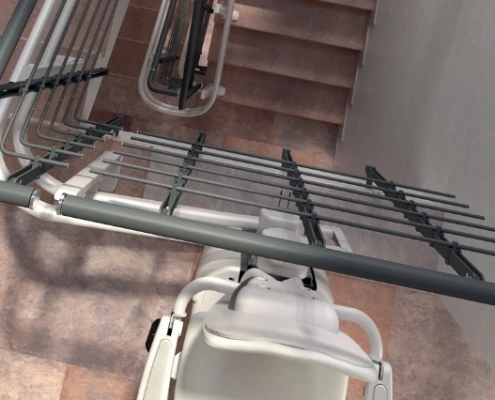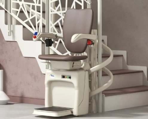 La STC-59 es una silla salvaescaleras diseñada específicamente para escaleras curvas, con posibilidad de instalación tanto en el lado interior como en el exterior de la escalera. Su diseño permite adaptarse a diferentes configuraciones, manteniendo un uso funcional del espacio disponible.